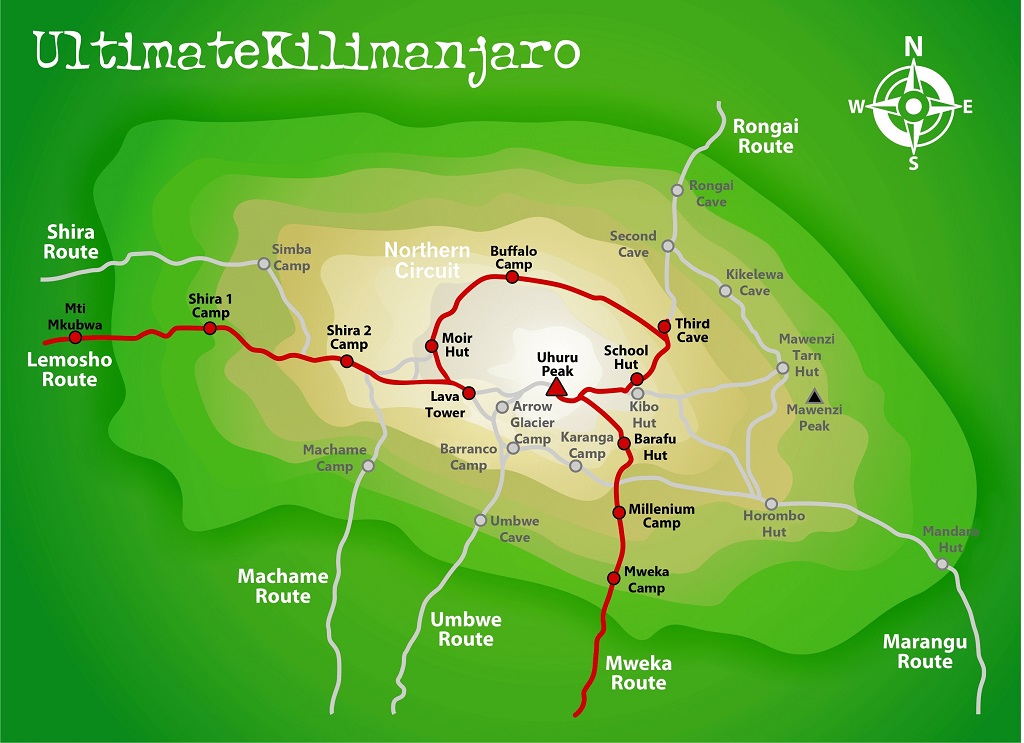 Map of Mount Kilimanjaro and Routes – Lemosho Route